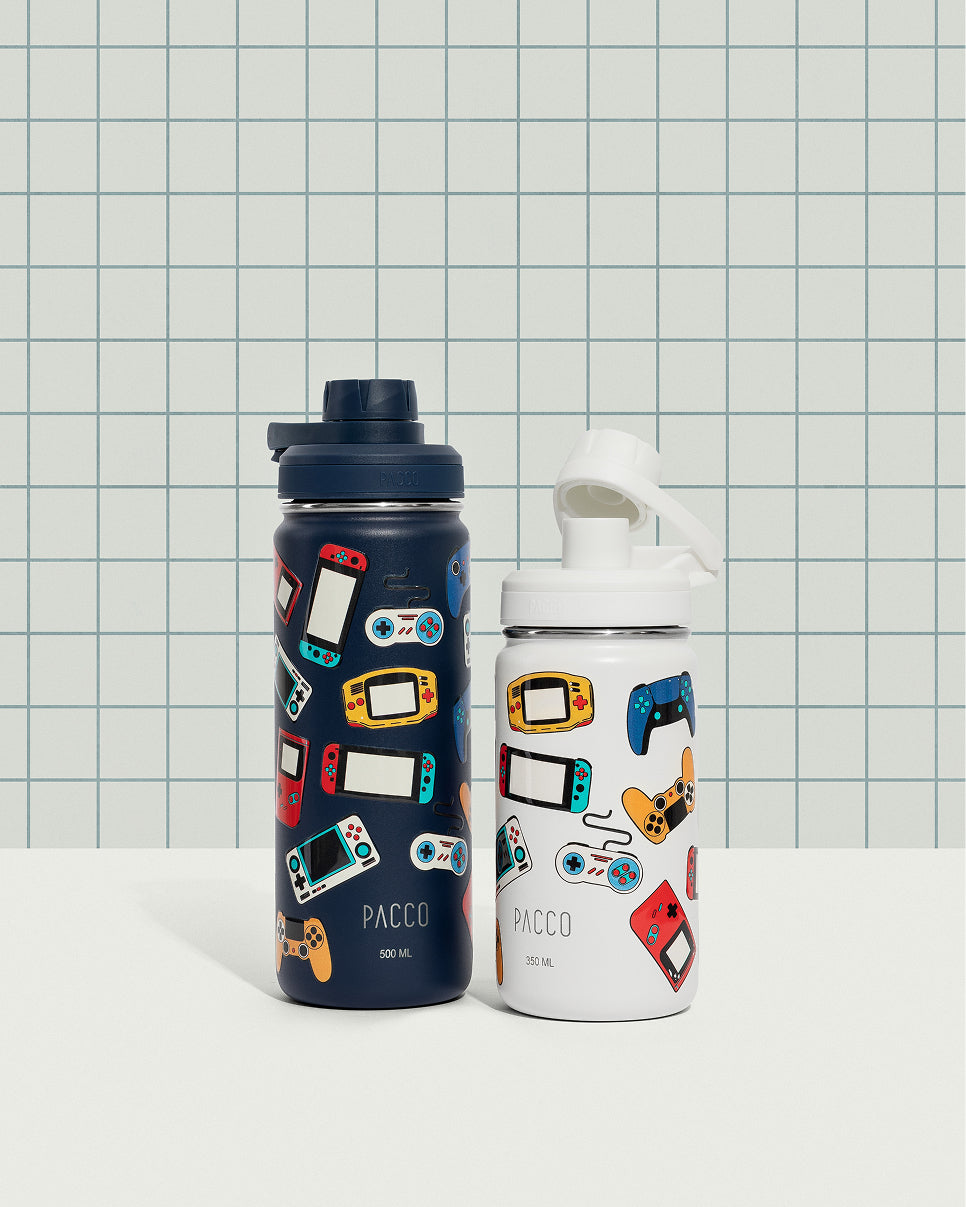 Garrafa térmica PACCO Kids branca de 500ml e preta de 500ml com estampa colorida de dinossauros. Possui tampa hermética branca e design ergonômico para crianças.